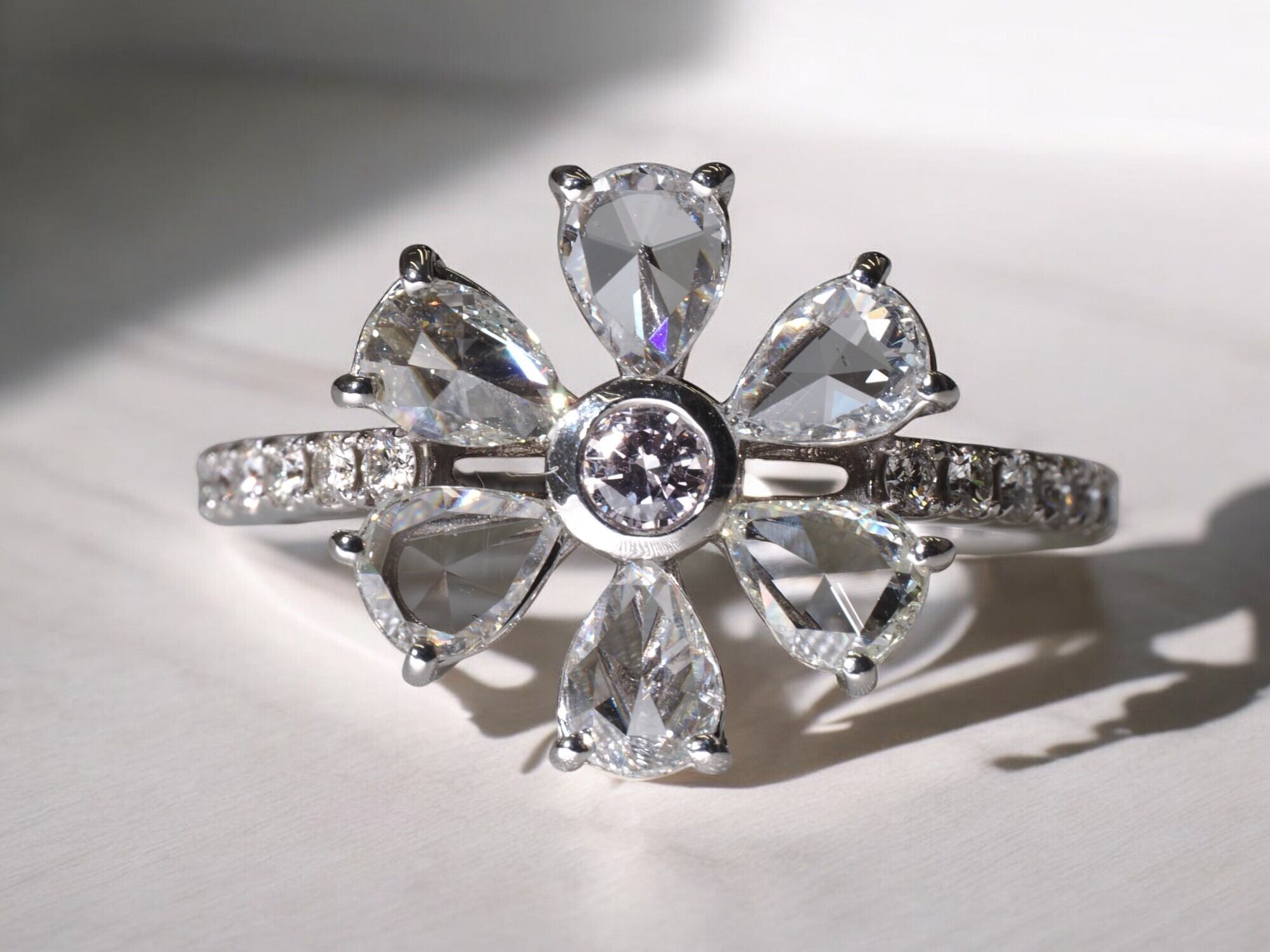 サイドにはペアシェイプのローズカットダイヤモンドを使用し、ローズカット特有の美しさ、強い輝きを存分に感じれるリングです。