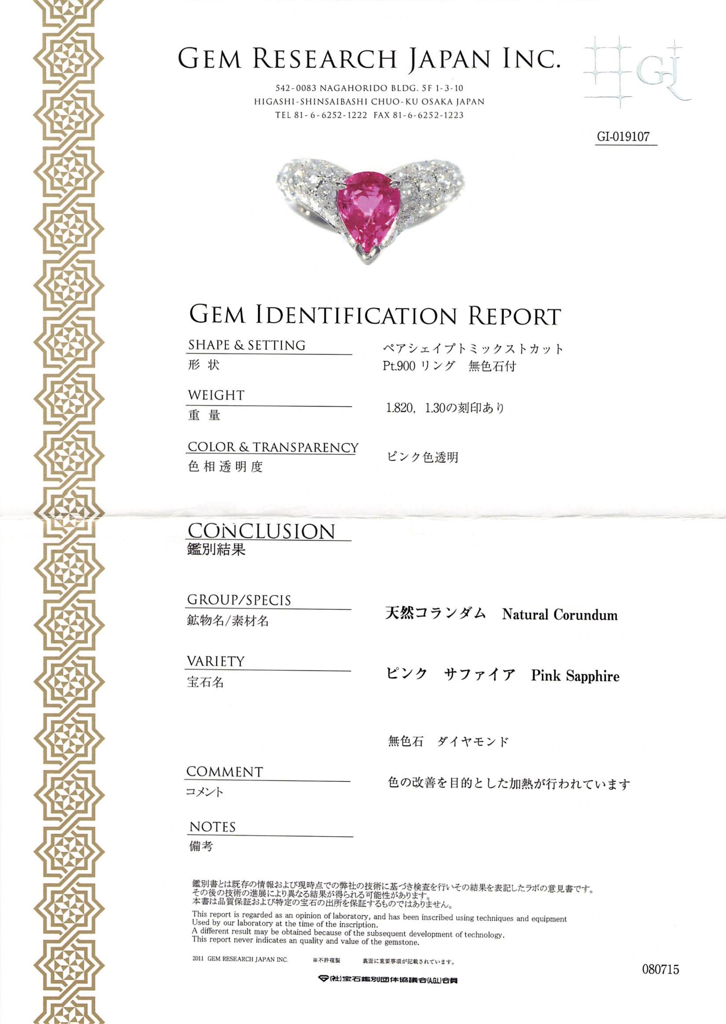 ネオンピンクサファイア 1.820ct ダイヤモンド 1.30ct Pt900 リング GRJ鑑別レポート付き