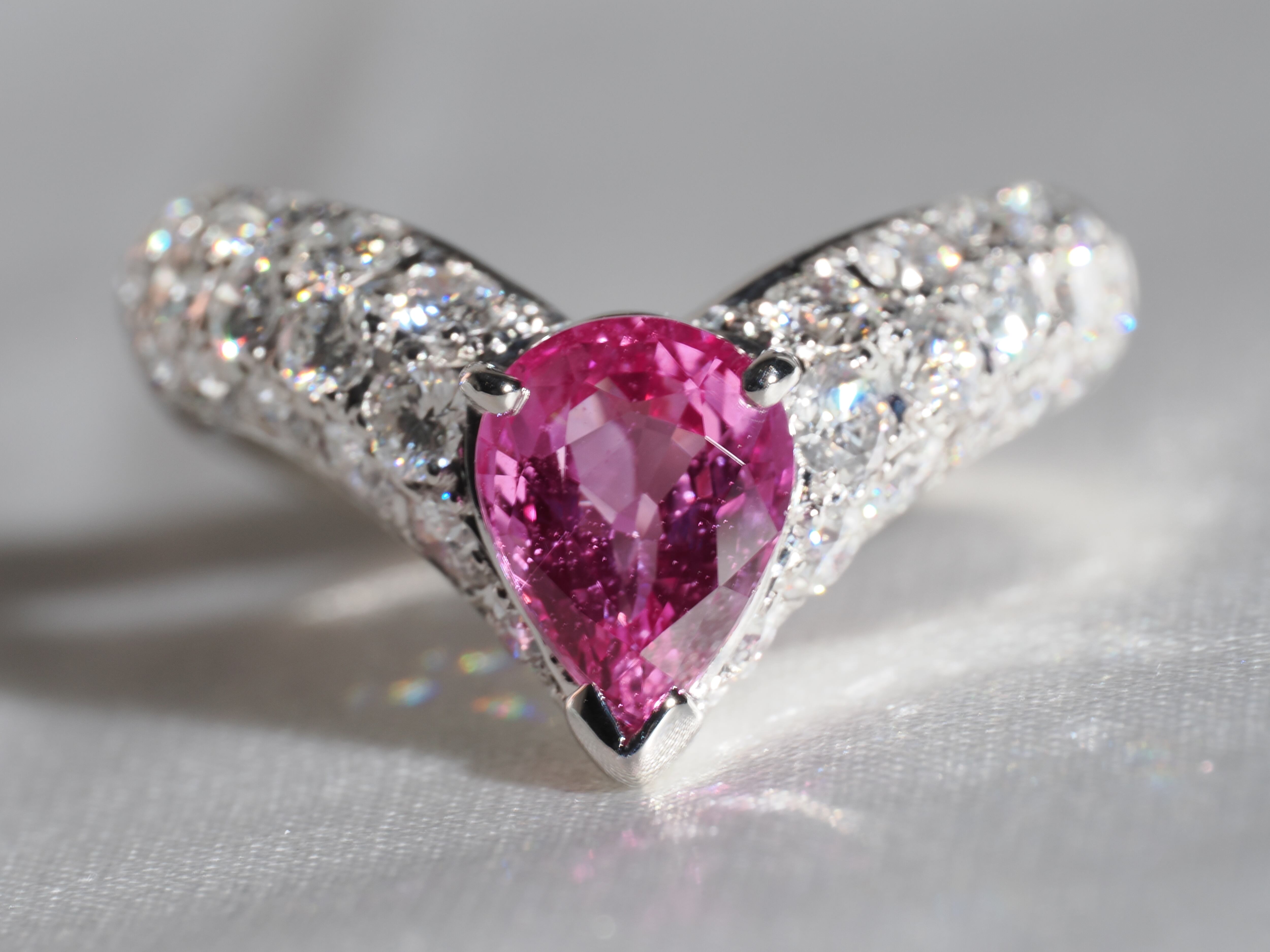 2カラットに迫るサイズ以上に、場面のあるサイズのピンクサファイアですのでカラット以上のサイズ感を感じることができ、パヴェダイヤも相まって非常にゴージャスな仕上がり。
