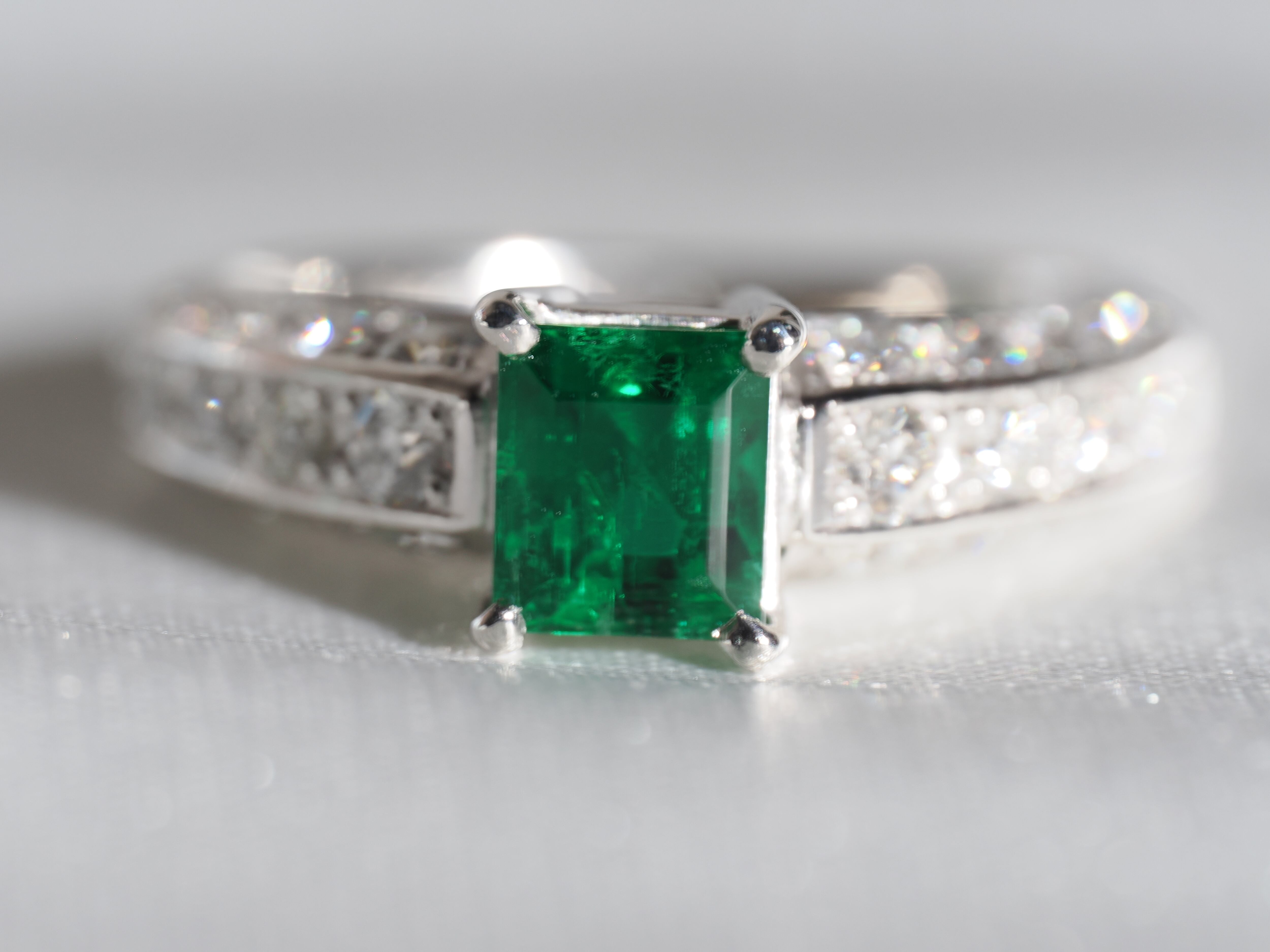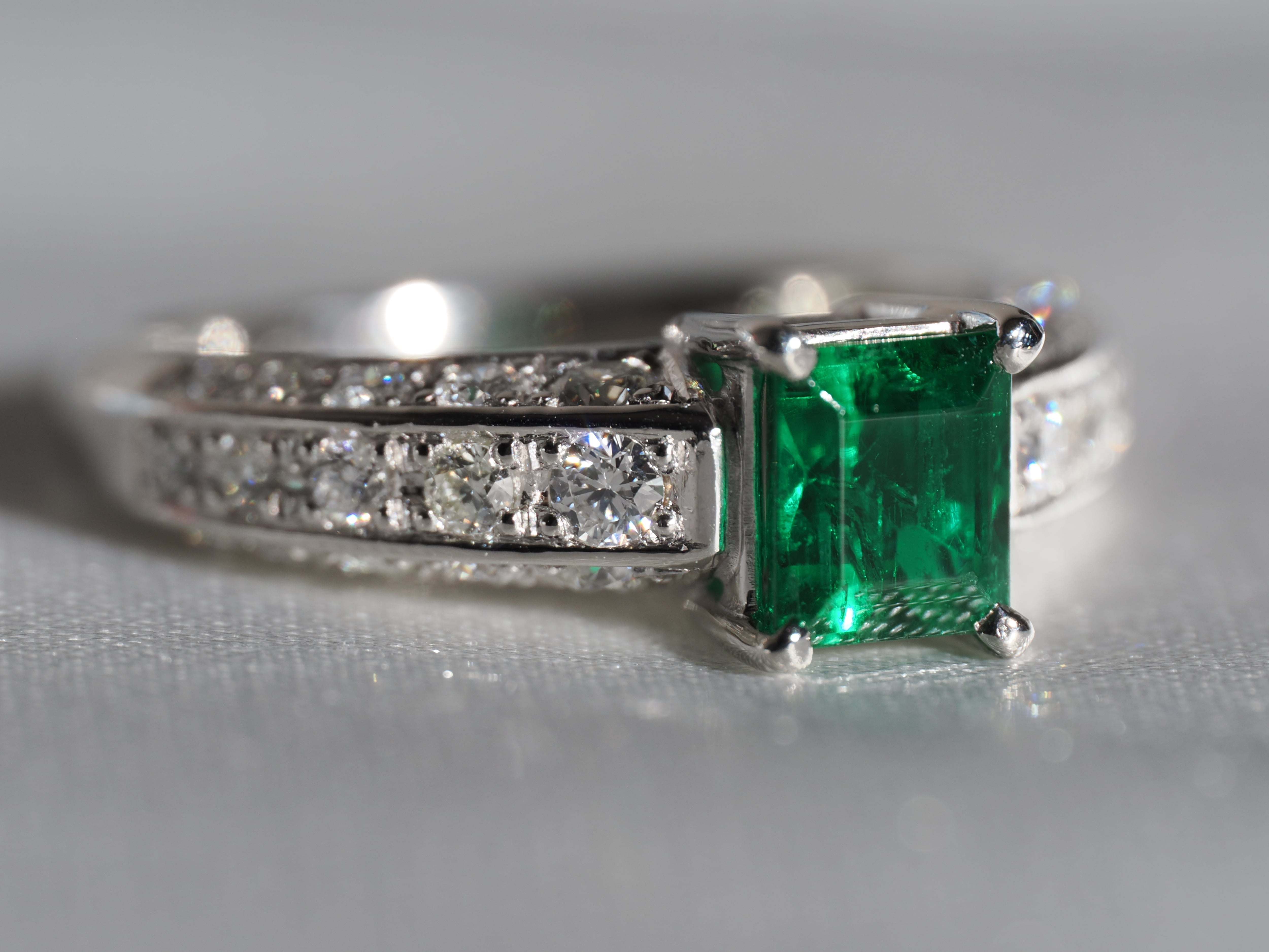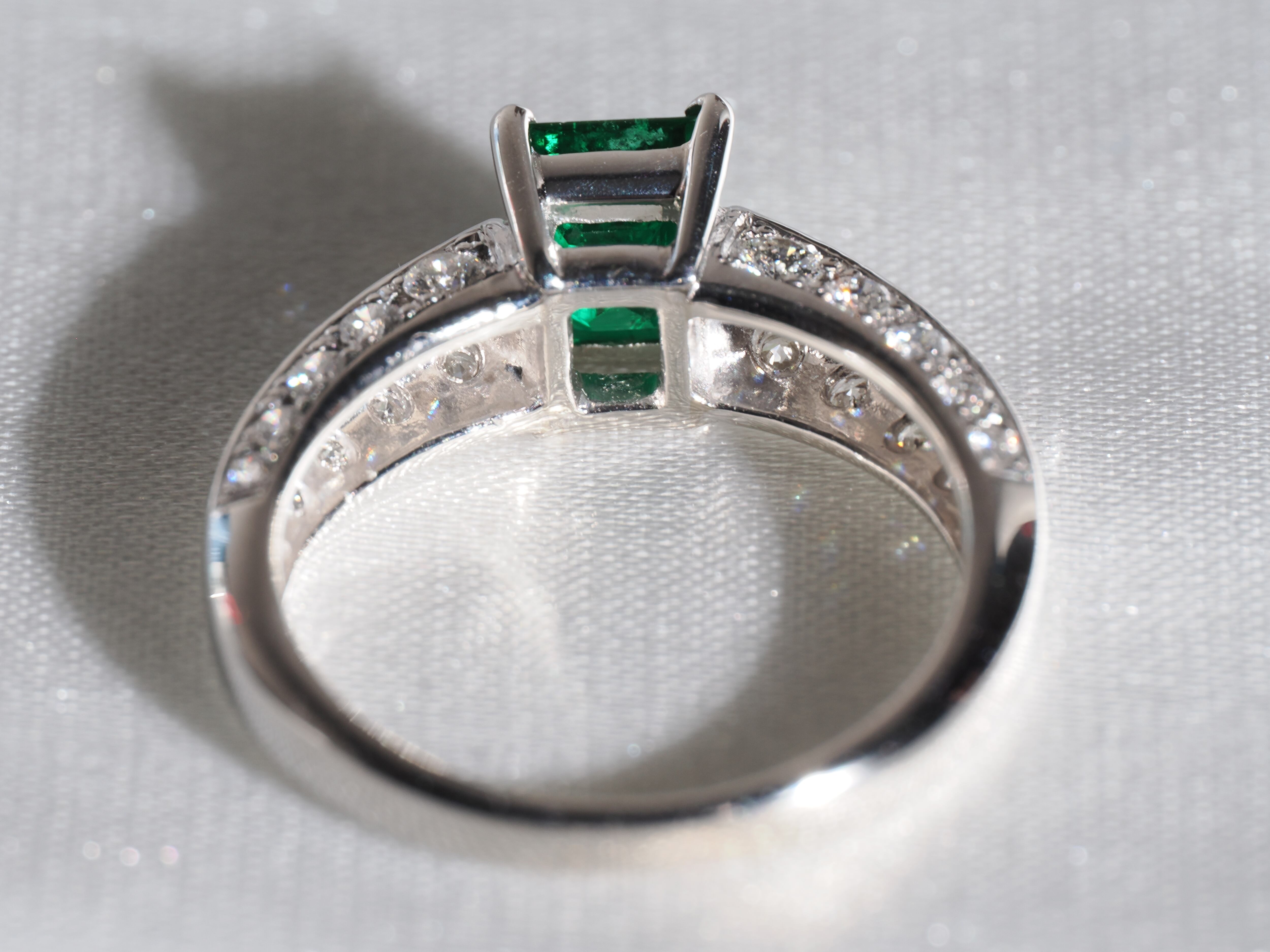 美しいスクエアのエメラルドカットの施されたエメラルドが非常に高貴な輝きを放つリングとなっております。